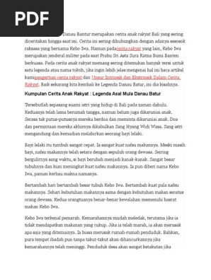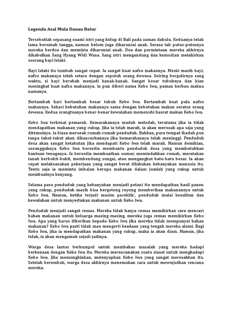 Timbunan tanah yang di sekitar danau itu kemudian berubah menjadi gunung dan disebut gunung batur. Posting pada sd ditag 3 keunikan desa trunyan asal usul selat bali singkat berasal dari kata apakah desa trunyan bibit pohon taru menyan bukit trunyan cara ke trunyan cara ke trunyan bali cerita anak daerah bali cerita rakyat gunung batur cerita sejarah dari jawa dan bali desa penglipuran desa trunyan terletak di filosofi trunyan. Berikutnya mari cari tahu cerita rakyat bali mengenai asal usul danau batur dan gunung batur di bali. Legenda kebo iwa dan asal usul danau batur alkisah di sebuah desa di bali tinggallah suami istri yang rukun dan kaya raya.